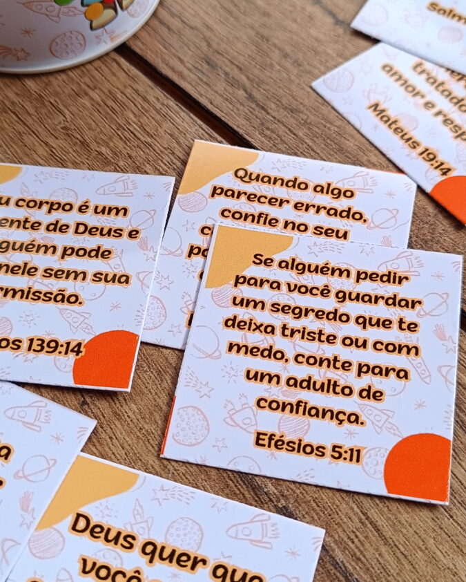 São 20 cartões repletos de promessas e verdades bíblicas que, todos os dias, lembram às nossas crianças o quanto elas são preciosas aos olhos do Senhor. 🌈 Cada frase é como uma sementinha plantada no coração: uma semente de fé, esperança e amor. 🌱💖