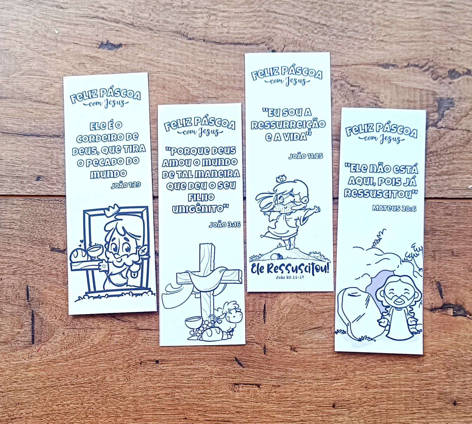 Este kit contém 10 marcadores para colorir. Com esse kit você vai poder colorir e guardar diversas passagens bíblicas sobre a Páscoa!